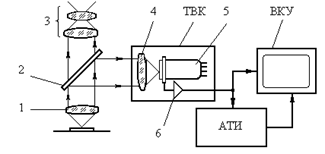 1 - микрообъектив, 2 - полупрозрачное зеркало, 3 - окуляр, 4 – объектив телевизионной камеры, 5 - телевизионная передающая трубка, 6 – блок формирования видеосигнала, ТВК - телевизионная камера, ВКУ - видеоконтрольное устройство, АТИ - анализатор телевизионных изображений