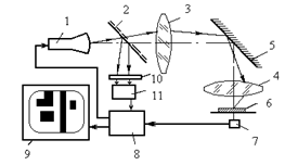 1 - ЭЛТ с бегущим пятном; 2 - полупрозрачное зеркало (светоделитель); 3 - окуляр микроскопа; 4 - объектив; 5 - зеркало; 6 - объект контроля; 7 - ФЭУ; 8 - электронная система; 9 - ВКУ; 10 - реперная координатная сетка (эталонная шкала); 11 - электронный блок с фотоприёмником, корректирующий абберации микрообъектива и нелинейность развёртки