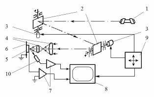 1-лазер; 2-вертикальный и горизонтальный дефлекторы (качающиеся зеркала); 3-электропривод дефлекторов; 4-оптическая система (обращённый микроскоп); 5-исследуемая микросхема; 6-предметный столик; 7-электронный блок обработки видеосигнала; 8-ВКУ; 9-генератор развёрток; 10-ФЭУ