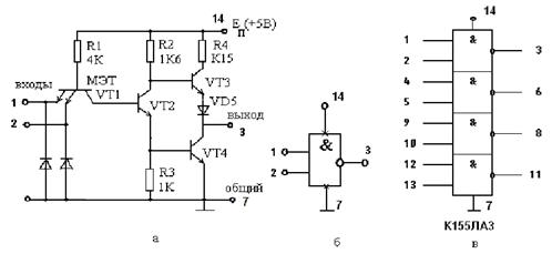 На рис. 3, а представлена принципиальная электрическая схема элемента И-НЕ, являющегося базовым элементом ТТЛ. На рис. 3, б показано условное обозначение ЛЭ на принципиальных электрических схемах. (Выводы питания +5 В и общий провод допускается не показывать). На рис. 3, в-нумерация выводов микросхемы К155ЛА3 (4 логических элемента 2И-НЕ).