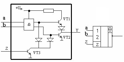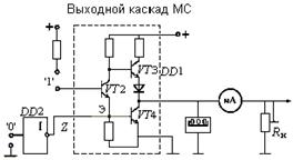 Существует категория МС, способных принимать и третье состояние, когда выход МС отключен от нагрузки. Такое состояние называют ВЫСОКОИМПЕДАНСНЫМ . Перевод МС в это состояние осуществляется по специальному входу Z. В зависимости от конкретного типа МС отключение выхода может осуществляться 1 или 0. Упрощенная электрическая схема элемента с тремя состояниями представлена на рис. 4. Когда на входе Z низкий уровень, то VT3 заперт и не влияет на работу схемы. Если Z имеет высокий уровень, то VT3 открыт и базы транзисторов VT1 и VT2 соединены с низким потенциалом (земля). Транзисторы VT1 и VT2 закрыты.
