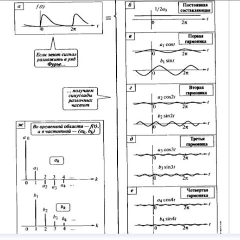 1. Сигнал любой формы можно разложить на синусоидальные составляющие с различными частотами, кратными целому числу. Совокупность этих составляющих называется спектром, а сумма этих составляющих формирует значение функции во временной области.