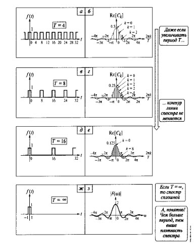 Но гармонический анализ периодических сигналов можно распространить на непериодические сигналы. При этом число гармонических составляющих, входящих в ряд Фурье, будет бесконечно большим, так как при