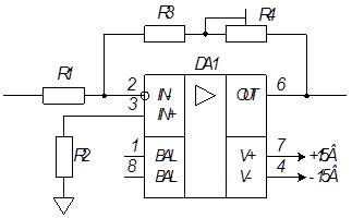 В данной схеме входное сопротивление определяется значением резистора R1. Для обеспечения единичного коэффициента усиления номинал резистора R3 будет равен номиналу резистора R1. Но последовательно с резистором R2 включен подстроечный резистор R4, поэтому номинал резистора R3 необходимо уменьшить на значение, равное половине значения номинала подстроечного резистора R4. Резистор R2 не влияет на значение коэффициента усиления и вводится для уменьшения изменений выходного напряжения, вызванных временными или температурными колебаниями входных токов. Значение R2 выбирают из условия