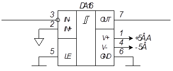 Схема определения знака реализована на быстродействующем компараторе, неинвертирующий вход которого подключен к выходу фильтра низких частот, а инвертирующий вход заземлен. Выход компаратора выведен на внешний порт. При положительной полярности сигнала компаратор выдаст высокий уровень, а при отрицательной – низкий.
