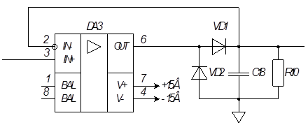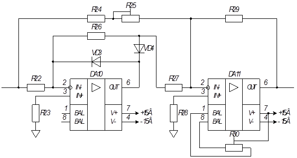 В качестве операционного усилителя используется К140УД26. Усилитель содержит на входе схему защиты входных дифференциальных каскадов от перегрузок и пробоя высоким входным напряжением.