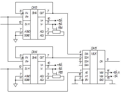 АЦП состоит из восьмиканального блока входных повторителя, мультиплексора входных каналов, активного фильтра низких частот, блока автоматического выбора пределов измерения, блока определения знака, масштабирующего усилителя, двухполупериодного выпрямителя среднего значения, устройства выборки-хранения, регистра последовательных приближений, ЦАП, компаратора, схемы управления, тактового генератора.