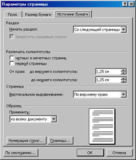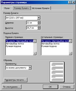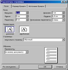 Стандартные параметры загружаются автоматически при создании нового документа. В окне параметры страницы есть три вкладки: поля, размер бумаги, источник бумаги. Основные редакции вносятся во вкладке поля (верхнее, нижнее, левое, правое – устанавливаются отступы, положение переплата: слева или справа; ориентация: книжная или альбомная; можно выбирать количество страниц которое можно разместить; можно установить применить ко всему документу или к какой - то его части; также можно нажать кнопочку по умолчанию в левом нижнем углу, и установятся установки стандартные).