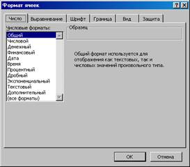 Форматирование числовых данных производится с помощью первой вкладки открывшегося окна. Можно выбирать различные числовые форматы: общий, числовой, денежный, финансовый, дата, время, процентный, дробный, и т.д.