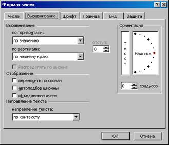 Выравнивание возможно по горизонтали: по значению, по левому краю, по правому краю, по центру и т.д.; по вертикали: по значению, по нижнему краю, по верхнему краю, по высоте и т.д.; можно также настроить в данной вкладке переносы в ячейках, автоподбор ширины, объединение ячеек; можно выбрать ориентацию отображения текста в ячейке; выбрать направление текста: слева направо, справа на лево, по контексту.