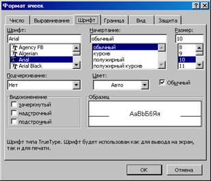 Следующая вкладка Шрифт. Здесь можно отформатировать шрифт в электронной таблице. Выбрать шрифт, начертание, размер, цвет, подчеркивание.