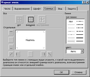 Следующая вкладка Граница. Здесь можно отформатировать обрамление границ таблицы: выбрать тип линии, цвет, обозначить наличие границ.