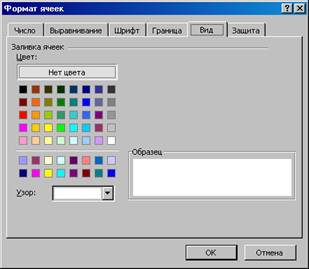 Следующая вкладка Вид. Здесь можно выбрать узор, цвет заливки, который можно применить к таблице, ячейке.