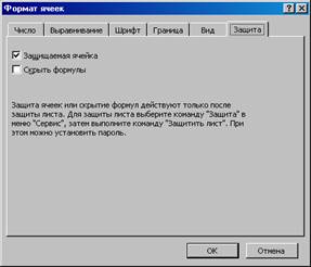 И последняя вкладка Защита. Можно установить защиту на ячейки, таблицу.