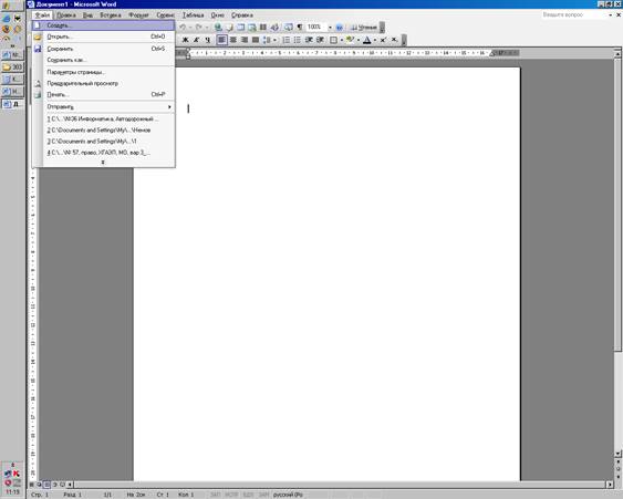 Создание нового документа можно произвести разными способами, например таким: на пустом месте на рабочем столе щелкнуть правой кнопкой мыши и выбрать создать документ Word; либо Пуск – Программы – MS Цщкв, Как правило открывается новый документ сразу после запуска программы, либо создать новый документ (Файл - создать).