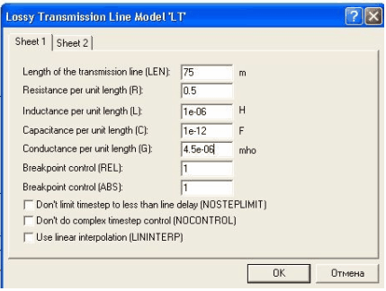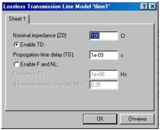 В окне, изображенном на рис. 2, задаются значения параметров эквивалентной схемы (рис.1,в ), где, кроме перечисленных выше параметров, указаны длина ЛС (LEN , м). В диалоговом окне для идеальной ЛС (R = 0, G = 0) (рис. 3) обозначено: ZO -волновое сопротивление, Ом; TD — время задержки распространения сигнала. Процессы, происходящие в ЛС, описываются так называемыми телеграфными уравнениями [51]: