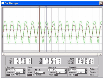 Из осциллограмм на рис. 5, полученных в результате моделирования, можно определить запаздывание α выходного сигнала относительно входного на длину линии в режиме бегущей волны ( α = 2πf(Т2-Т1)), а из индикаторных окон – амплитуды входного Uim =VA1 и выходного Uom =VB2 напряжений.