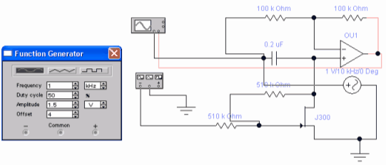 Ограничимся рассмотрением статического режима, заменив сопротивление полевого транзистора сопротивлением R. В таком случае напряжение на неинвертирующем входе OU1 в операторной форме будет иметь вид: Ui'(p) = Ui(p)pRC/(l + pRC). Это напряжение передается на выход OU1 с коэффициентом передачи 1 + R2/R1 = 2. Напряжение Ui(p) передается на выход того же усилителя с коэффициентом передачи R2/R1 = 1, причем с инвертированием сигнала. Следовательно, выходное напряжение OU1