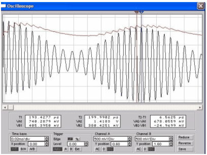 Сигнал с выхода колебательного контура измеряется осциллографом и подается на вход амплитудного детектора, формирующего модулирующее (низкочастотное) колебание, которое также можно наблюдать на экране (Рис.10) осциллографа по каналу В.