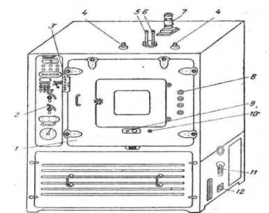 6 — «влажный» контактный термометр; 7 — осевой вентилятор; 8 — отверстия, закрытые гайками с резиновыми пробками для ввода высокочастотных кабелей; 9 — тумблер для включения обогревателя стекол; 10 — отверстие для обмена воздуха; 11 — контактный термометр регулятора влаги; 12 — штепсельный разъем.