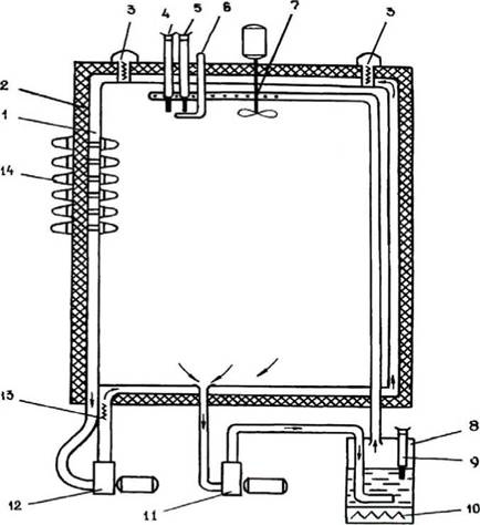Температурный режим в испытательной камере обеспечивается циркуляцией нагретого воздуха в рубашке камеры, создаваемой центробежным вентилятором 12 и электронагревателем 13, расположенными под дном камеры. Электронагреватель воздуха в камере выполнен в виде вставной легкосъемной кассеты. Для регулировки мощности электронагревателя под блоком автоматики установлен автотрансформатор. Между передней панелью блока автоматики и дверью камеры расположены шесть гнезд электровводов 14 для электрической связи испытываемых изделий с контрольно-измерительным оборудованием. Для ввода в камеру высокочастотных кабелей в двери камеры имеется четыре отверстия, закрытых гайками с резиновыми пробками. Камера оборудована блокировкой, разрывающей цепь питания камеры при открывании двери.