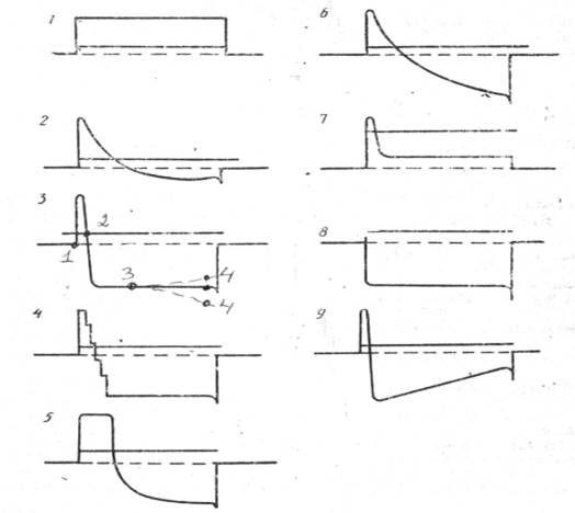 Рис 2. 1 – несмачивание; 2 — плохое смачивание; 3 — хорошее смачивание' 4 — быстрое смачивание для изделий с большой теплоемкостью; 5 —замедленное смачивание; 6 — медленное смачивание; 7 — несмачивание; 8 — очень быстрое смачивание; 9 — нестабильное смачивание.