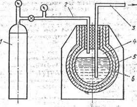 1-баллон со сжатым газом;2- трубопровод с клапанами; 3- трубка; 4- сосуд Дьюара; 5- вакуумно-порошковая изоляция; 6- жидкий хладогент