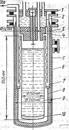 1-крышка; 2-сосуд с жидким азотом; 3,8-экраны;; 4-пенополиуретан; 5-вакуумно-многослойная изоляция; 6- кожух; 7-горловина гелиевого сосуда; 9-сосуд с гелием;10-адсорбент(активированный уголь)