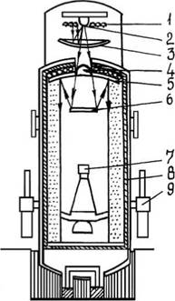 1 — ртутно-ксеноновые лампы; 2 — гнперболоидное зеркало; 3 — параболоидное зеркало; 4 — линза; 5 — главное коллимирующеепараболоидное зеркало; 6 — многогранный отражатель; 7 — рабочая зона с испытываемый КА; 8 — криогенные экраны;9 — диффузионные насосы