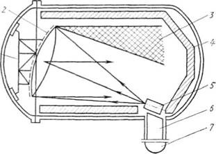 1 — кронштейн для крепления и юстировки фасет зеркала; 2 — сферическое зеркало; 3 — зона невозврата лучей; 4 — криогенные экраны; 5 —источник лучистой энергии; 6 — кронштейн для крепления