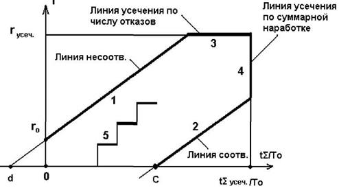 • если число отказов изделий в процессе испытаний r<rУСЕЧ . и tΣ > tΣ УСЕЧ , т.е. график достигает отрезка 4 прямой.