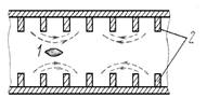 Рисунок 4 - Диафрагмированный волновод с бегущей волной: 1 — ускоряемый сгусток электронов; 2 — диафрагмы; штриховыми линиями показано распределение магнитного поля.