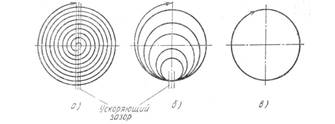 а — спиральная (циклотрон); б — спиральная (микротрон); в — круговая (бетатрон).