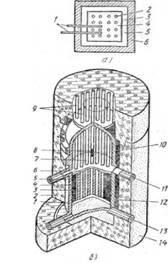 а — схематический разрез(1 — регулирующие стержни; 2 — блок с топливом; 3 — активная зона; 4 — замедлитель нейтронов; 5 — отражатель нейтронов; 6 — защитноеустройство); б — конструкция(1 —нижняя опорная плита; 2 — каналы охлаждения биологической защиты; 3 — тепловыделяющий элемент; 4 — корзина реактора; 5 — автоматически регулирующий стержень; 6 — верхняя опорная плита; 7 — компенсирующий стержень; 8 — стержень аварийной защиты; 9 — тяги системы управления и защиты; 10 — крышка реактора; 11 — трубопровод для выхода теплоносителя; 12 — корпус реактора; 13 — трубопровод для входа теплоносителя; 14 — биологическая защита)