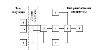 1 — испытываемые изделия; 1а — дозиметры и датчики температуры; 2 — блок датчиков; 3 — блок коммутации и согласования; 4 — регистрирующая аппаратура; 5 — командный блок; 6 — вспомогательная аппаратура; 7 — блок измерений; 8 — блок питания.