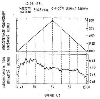 Дополнительную проверку того, не является ли излучение второй гармоники излучением нагревного стенда позволила провести сама природа. В эксперименте 6.03.84 г. МПЧ на трассе Тромсе-Мурманск изменялась во время сеанса от 13 МГц до 6 МГц, превышая в начале сеанса частоту второй гармоники и затем уменьшаясь становилась ниже этой частоты. Если бы при этом сигнал второй гармоники излучался нагревным стендом, то в начале сеанса уровень принимаемого сигнала должен быть на несколько порядков выше, чем в конце. В эксперименте же уровни сигнала второй гармоники как в начале, так и в конце сеанса, оставались одинаковыми.