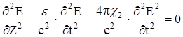 Рассмотрим случай, когда в ионосфере распространяется одна мощная волна накачки (или две радиоволны с одинаковыми частотами). Считаем распространение вертикальным (вдоль оси Z) и ограничимся учетом лишь квадратичной зависимости поляризуемости Р от поля волны накачки. При таких предположениях Волновой процесс в ионосферном слое будет удовлетворять уравнению: