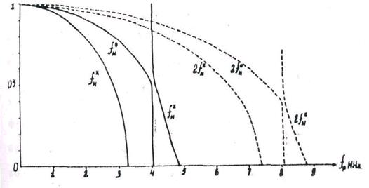 В другом случае когда Vэфф < Vэфф,с и в особенности Vэфф << Vэфф,с характер дисперсионных кривых n1,2 (w) близок к имеющим место в отсутствие поглощения (s = 0). В качестве примера на рис. (1.2) представлены показатели преломления для волны накачки (f = 4,09 МГц) и второй гармоники. Видим, что величина показателя преломления для второй гармоники всюду превосходит величину показателя преломления для волны накачки. Различие между ними возрастает по мере возрастания электронной концентрации. Таким образом при Vэфф << Vэфф,с наблюдается сильный рассинхронизм между волной накачки и второй гармоникой: