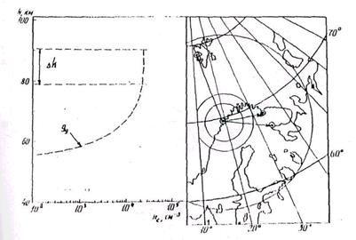 Слева: выбранный участок профиля нижней ионосферы; справа: пересечение максимумов "диаграммы" решетки получателей 2 гармоники с Землей