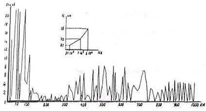 Расчет поля проводился на ЭВМ по следующей методике. Профиль в пределах высот от 50 до 100 км аппроксимировался линейно-показательными отрезками. Затем, с шагом 1/1000 высотного интервала отрезка определялась величина поля второй гармоники и от такого "элементарного излучателя" определялось поле на Земле с шагом 5 км в пределах расстояний 0-1000км от места под областью возмущения ионосферы. Результирующее поле на Земле определялось как суперпозиция полей, приходящих в данную точку от излучателей, рассчитанных для всего профиля. На рисунке (1-5) представлен график уровня поля второй гармоники на Земле для профиля ионосферы с кусочно-линейной аппроксимацией, показанной на этом рисунке. Как видно из рисунка (1-5) и в этом случае интерференционная картина поля второй гармоники на Земле неоднородна и имеет достаточно четко выраженные максимумы и минимумы. Последнее обстоятельство с одной стороны усложняет проведение эксперимента (имея один приемный пункт можно попасть в зону минимума приема), а с другой стороны позволяет при наличии нескольких приемных пунктов, разнесенных по пространству, проверить принцип и методику расчета при наличии n(h) профиля, полученного, например, с помощью установки некогерентного рассеяния радиоволн или частичных отражений.