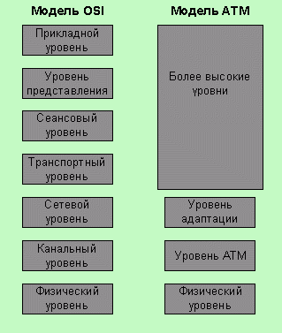 Место ATM в семиуровневой модели OSI - где-то в районе уровня передачи данных. Правда, установить точное соответствие нельзя, поскольку ATM сама занимается взаимодействием узлов, контролем прохождения и маршрутизацией, причем осуществляется это на уровне подготовки и передачи пакетов ATM.