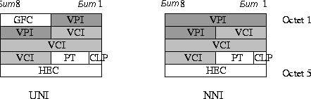 На рисунке 4 показаны поля заголовка АТМ - ячеек, имеющих интерфейс пользователя с сетью (UNI - User-to-Network Interface) и интерфейс между сетями (NNI - Network-to-Node Interface или Network-to-Network Interface).