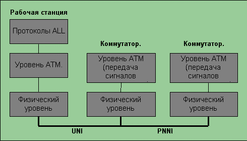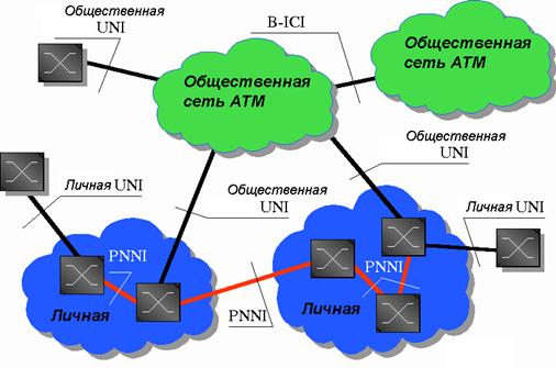 Американский национальный институт стандартов (ANSI) и Международный консультативный комитет по телефонии и телеграфии (CCITT, МККТТ) начинали разработку стандартов ATM как набора рекомендаций для сети B-ISDN (Broadband Integrated Services Digital Network). ITU теперь называется Международным союзом электросвязи (International Telecommunications Union - ITU). B-ISDN - высокоскоростная сеть, которая использует ATM в качестве транспортного механизма. Стандарт B-ISDN определяет для ATM интерфейсы User-to-Network Interface (UNI) и Network-to-Network Interface (NNI). Кроме того, он устанавливает следующие три уровня: