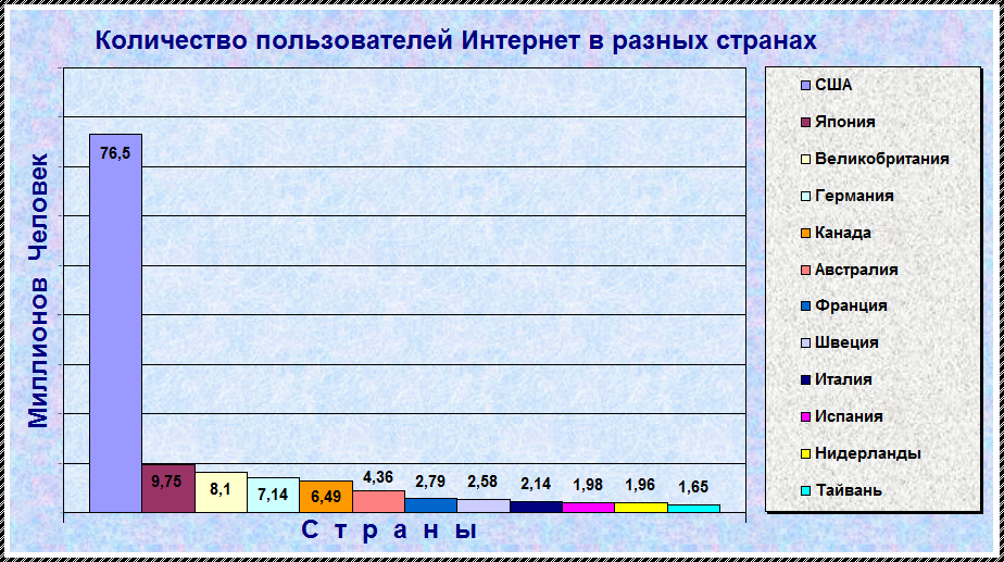 Оставшиеся пять стран в списке были: Нидерланды – 1,96млн. пользователей Интернет, Тайвань – 1,65млн., Китай – 1,58млн., Финляндия – 1,57млн. и Норвегия – 1,34млн. Взятые вместе, эти 15 стран составляют 89% мирового «населения» Интернет. Глобальная сеть Интернет претендует на то, чтобы объединить все средства вещания и коммуникации, компьютерные, телефонные, радио - и видео-сети, связав их в единое «киберпространство».