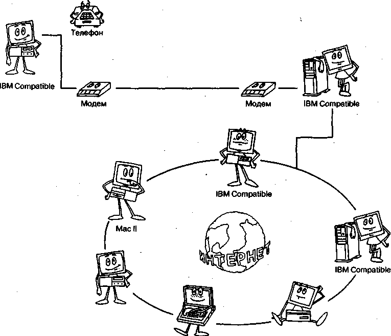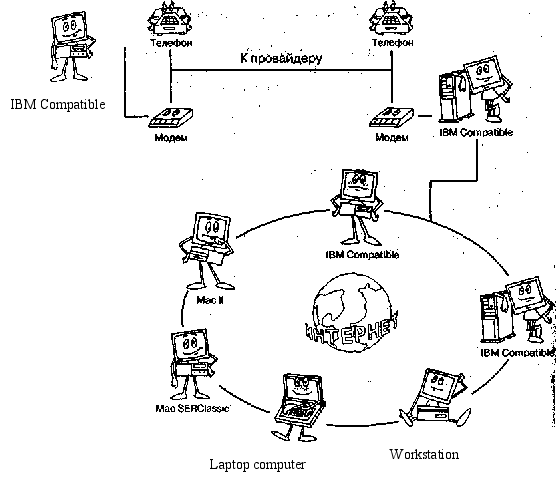 Більшість постачальників послуг Internet чи, як їх ще називають, провайдерів (Internet Service Provider, ISP) забезпечує доступ по телефонній мережі, що комутирується, (мал. 3.1). Для підключення вам необхідно мати телефонну лінію і модем (опис модемів читайте нижче). Провайдер надає вам кілька місцевих телефонних номерів, що ви набираєте, використовуючи комунікаційну програму, що входить, наприклад, до складу операційної системи. Далі, як правило, необхідно ввести ім'я користувача і пароль, після перевірки правильності яких установлюється з'єднання.