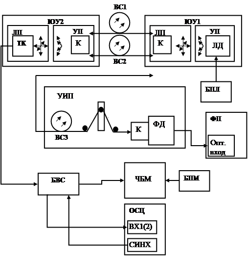 – взаимную юстировку оправки для коннектора (К) торца исследуемого световода и источника ЛД (ЮУ1). Данная регулировка позволяет изменять уровень оптической мощности, вводимой в исследуемый световод, для обеспечения удобства проведения измерений;