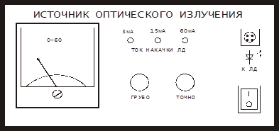 – регулировки тока накачки с помощью потенциометров «грубо», «точно», ручки которых выведены на лицевую панель. Изменение тока накачки позволяет изменять мощность излучения лазерного диода;