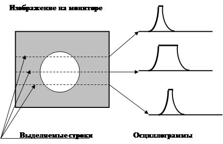 10. Включить питание осциллографа. Его органы управления установлены в положение, при котором осциллограмма на его экране соответствует одной из строк видеосигнала, наблюдаемого на экране монитора.