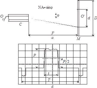 Рис. 9. Схема светового конуса на выходе из световода (а ) и осциллограмма (б )