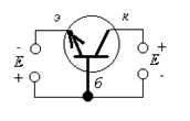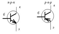 Как видно, схематическое изображение совсем не похоже на их действительную конструкцию. Но так принято. Кружок символизирует корпус транзистора. Индексом "б" обозначен контакт к базе, "к" обозначает контакт к коллекторной области, а "э" – к эмиттерной области. Направление стрелки у эмиттерного контакта определяет тип транзистора (п-р-п или р-п-р).